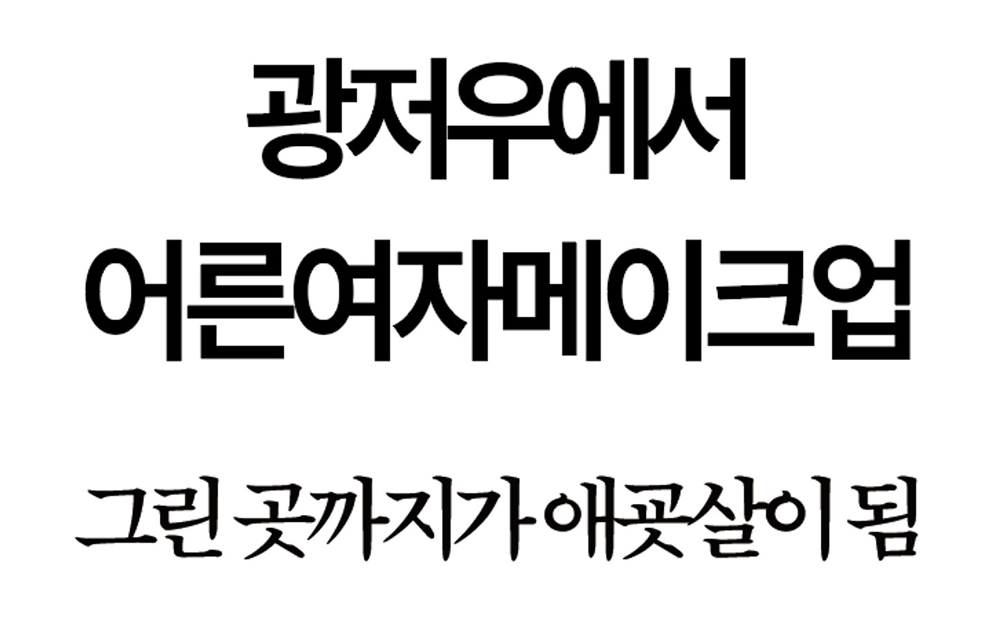 광저우에서 어른 여자메이크업 - 프리젠테이션(무료) -> 기본폰트에서 자간 -40 ~ -70으로 적용했네요! (https://freesentation.blog/freesentation) 그린 곳까지 애굣살이 됨 - 부크크 명조 Bold(무료) https://bookk.co.kr/font -> 기본폰트에서 자간 -100으로 적용했네요!